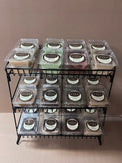 The wider display has the same height and depth as the narrow display but is 20 inches wide and holds 80 tubs. This rack costs $50 but that price is offset with an additional seven free tubs.